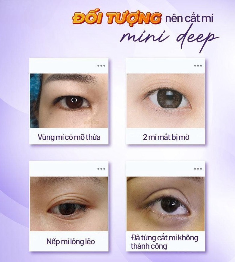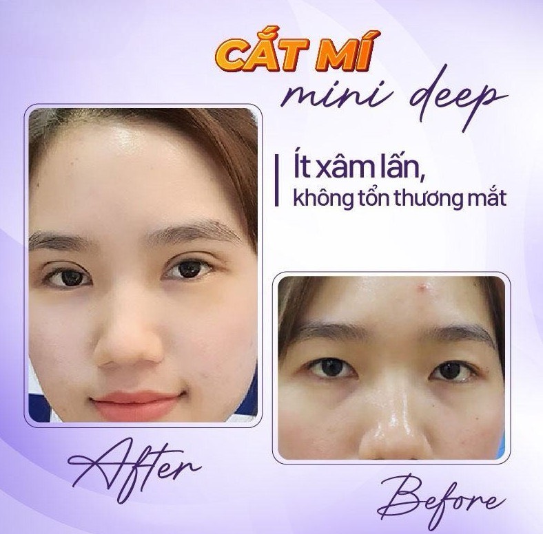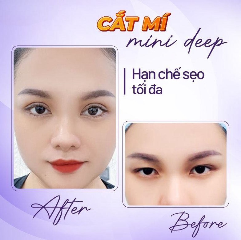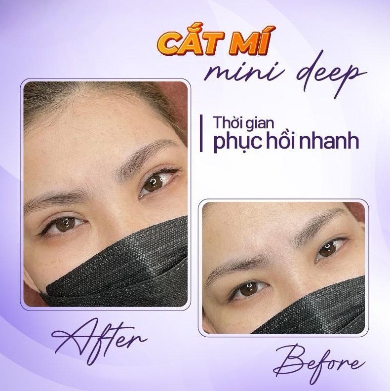 Như tên gọi mini của mình, cắt mí mini deep là phương pháp cắt 1 phần da dư nhỏ ở giữa bên trên cơ nâng mi loại bỏ mỡ mí mắt tạo thành nếp mí mới giữ được nếp mí lâu hơn nhấn mí và đặc biệt nhanh lành.